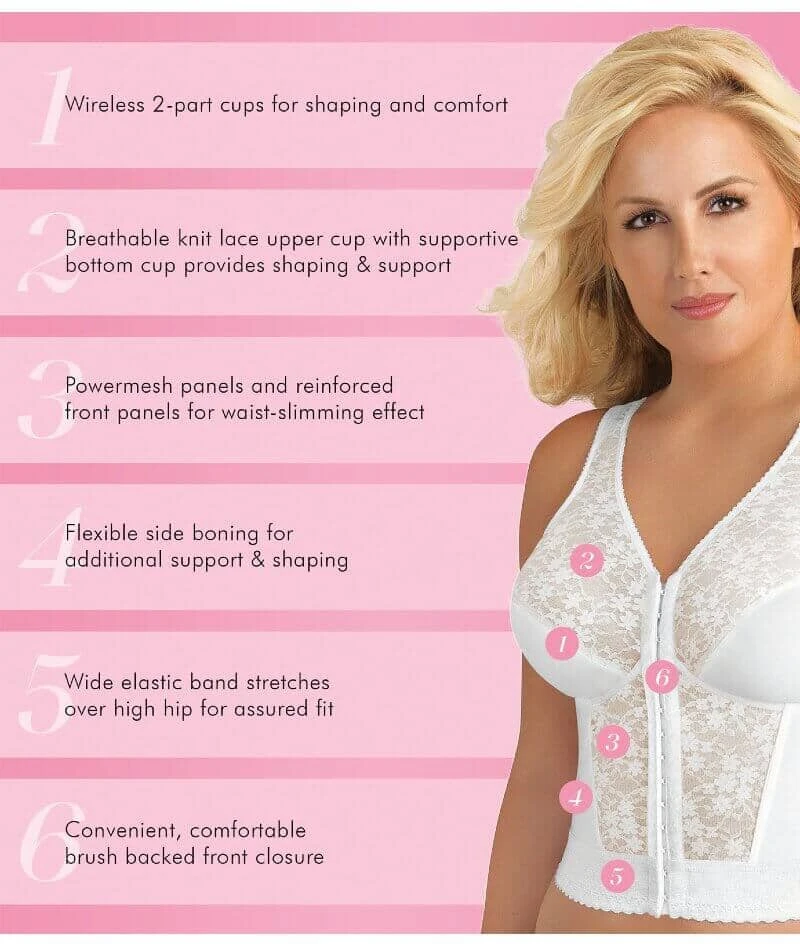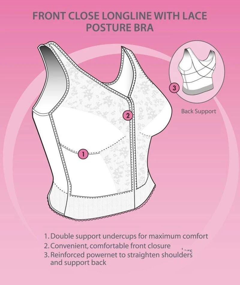 The Exquisite Form® Fully® Front Close Longline Posture Bra with Lace. Crafted to provide support and convenience without sacrificing femininity. Features front closure and lovely lace panels on the front for a soft touch. Full-coverage, wirefree cups provide excellent support. Wide comfort bands reduce irritation. Designed to help push any extra curves down and improve posture.