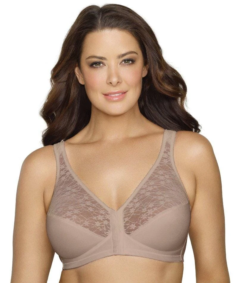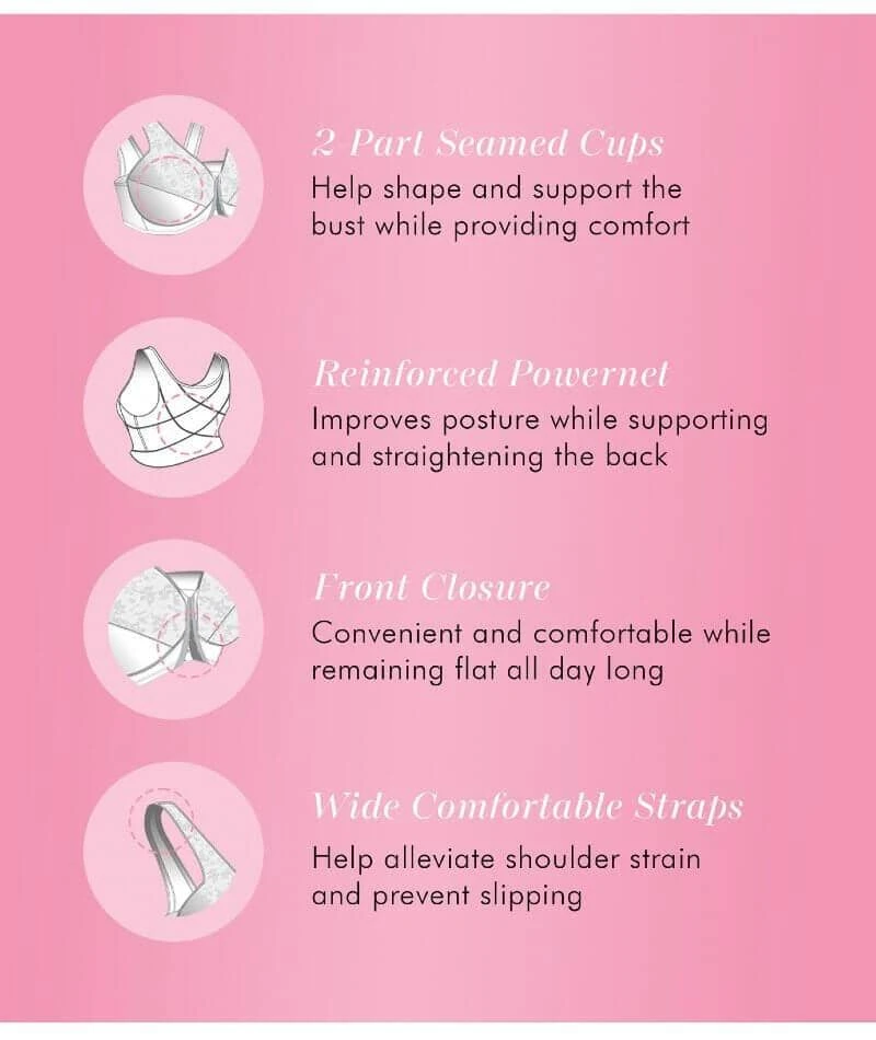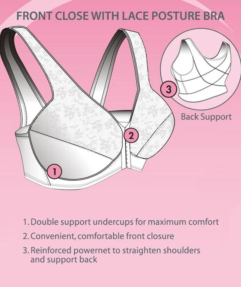 The Exquisite Form® Fully® Front Close Posture Bra with Lace. The secret to helping your figure fall beautifully into place. Reinforced crisscross powernet stretch fabric straightens shoulders and supports your back to create a noticeable difference in posture. Wide stretch sides and wide camisole straps offer exceptional comfort. Two-piece cups feature lovely lace tops and double support undercups that give your figure excellent support and a gentle lift for a youthful silhouette.