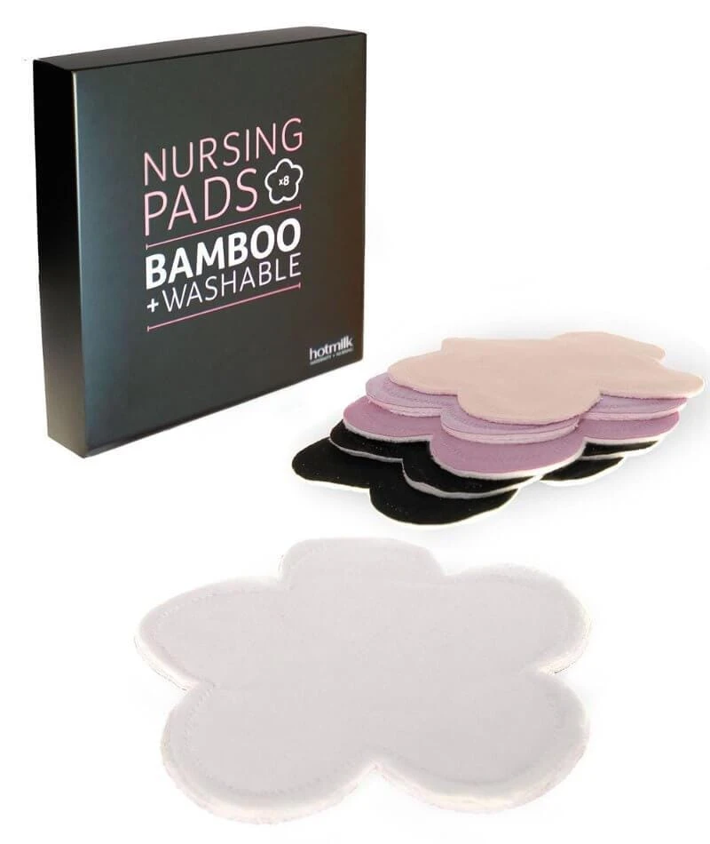 The bamboo fibre is thermo-regulating which means it will keep you warmer in winter and cooler in summer. Naturally hypoallergenic and more absorbent than cotton making them ultra gentle against your skin. The 8 pack includes 4 double layered thicker pads for overnight use in signature Hotmilk pink, 2 thinner daytime pads in everyday nude and 2 daytime pads in staple black to go with every outfit.