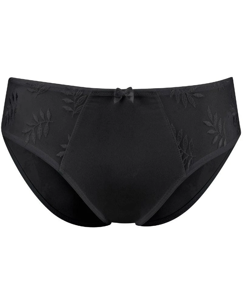 • Deep brief features fine rigid mesh, embroidered with elegant leaf design.