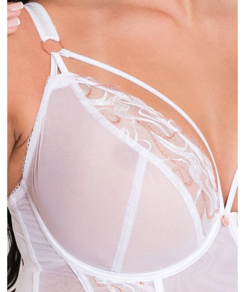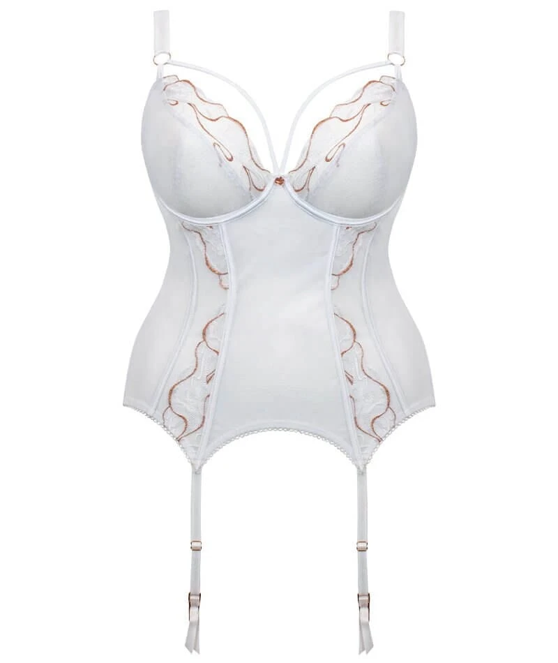 The Fascinate Plunge Basque is here to do just that, in decadent White you’ll be set for 360 degrees of seduction. Featuring a plunging neckline and semi sheer mesh fabric that skims over your curves, creating the perfect silhouette that cinches in your waist to tantalise and fascinate. The rose gold embroidery runs down your waist in an hourglass shape, enhancing your figure. Fascinate is the perfect Honeymoon staple that will have you looking like an angel and feeling irresistible.